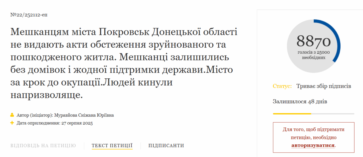 Одна з жительок Покровська зареєструвала на сайті президента петицію з проханням повпливати на владу Покровська та забезпечити дистанційне обстеження зруйнованих будинків. Також вона вимагає, щоб Покровська МВА щотижня звітувала про кількість виданих ними актів та встановила чіткі строки видачі документів — не пізніше 1 місяця з моменту звернення.