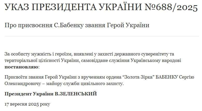 Рятувальнику з Мирнограда Сергію Бабенку присвоєно звання «Герой України»