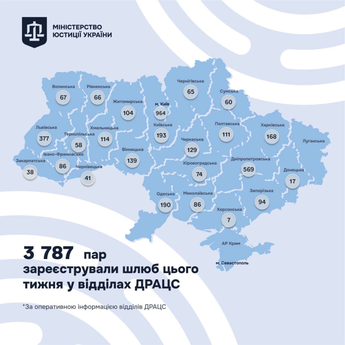Загалом по Україні цього тижня уклали шлюб 3 787 пар, зокрема: