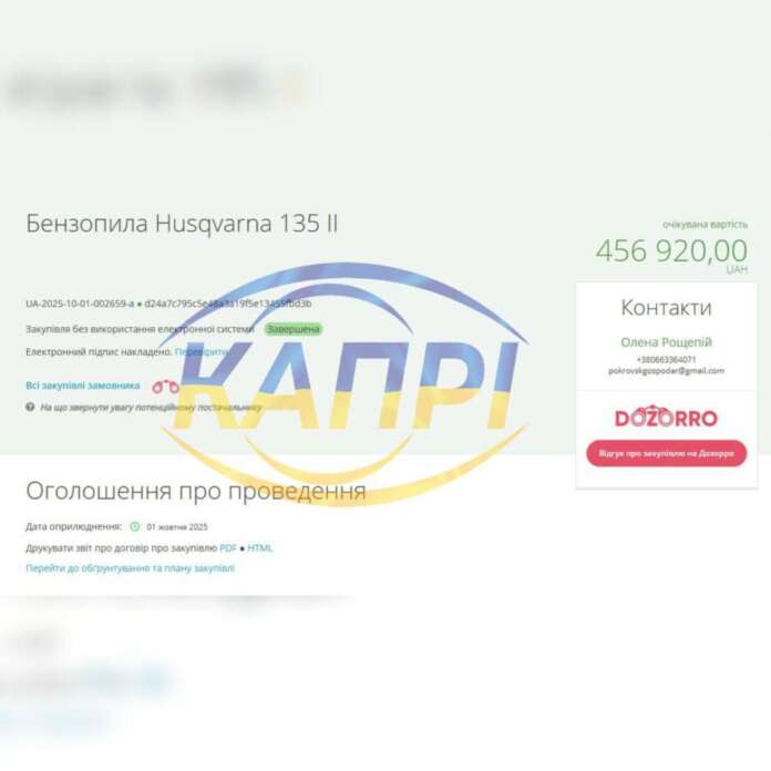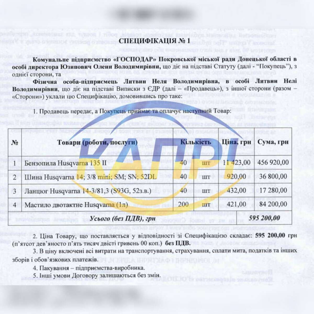 30 вересня комунальне підприємство “Господар” з Покровська уклало договір на придбання бензопил у підприємиці з Дніпра. Про це стало відомо з системи публічних закупівель Прозорро.