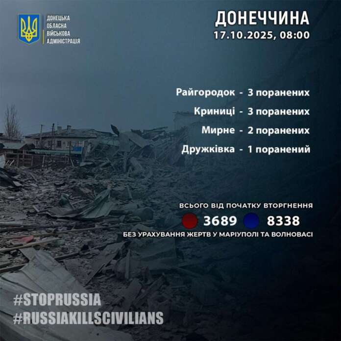 АктуальноНовости За 16 жовтня росіяни поранили 9 мирних жителів Донеччини. 17 октября 2025 - 08:00 Поделиться Facebook Twitter Telegram WhatsApp Viber VK За 16 жовтня росіяни поранили 9 мирних жителів Донеччини. Під ворожим вогнем опинилися: 📍 Райгородок — 3 поранених 📍 Криниці — 3 поранених 📍 Мирне — 2 поранених 📍 Дружківка — 1 поранений - Реклама -