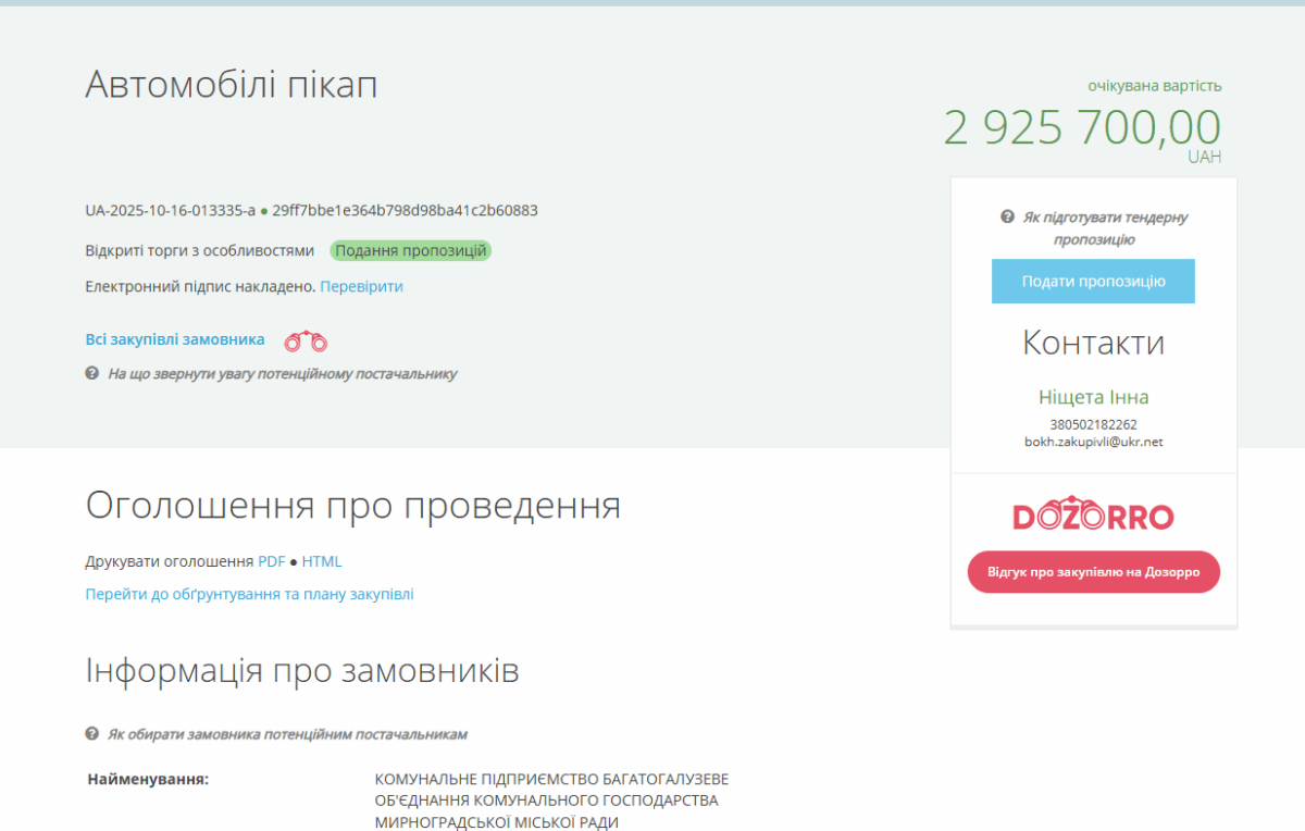 Згідно з тендерною документацією, КП «БОКГ» планує придбати два повнопривідні дизельні пікапи з подвійною кабіною на п’ять місць.