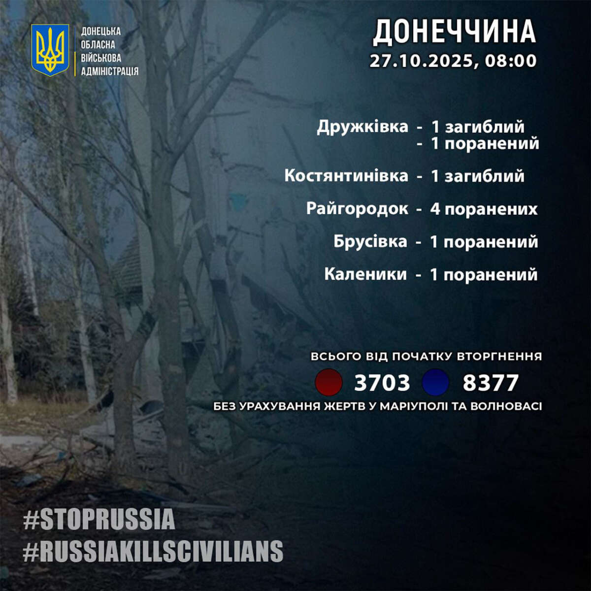 За 26 жовтня росіяни вбили 2 жителів Донеччини: у Костянтинівці та Дружківці.