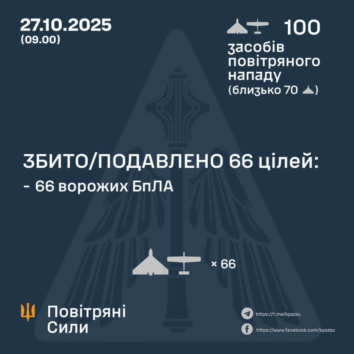 У ніч на 27 жовтня російські війська атакували 100 ударними безпілотниками територію України.