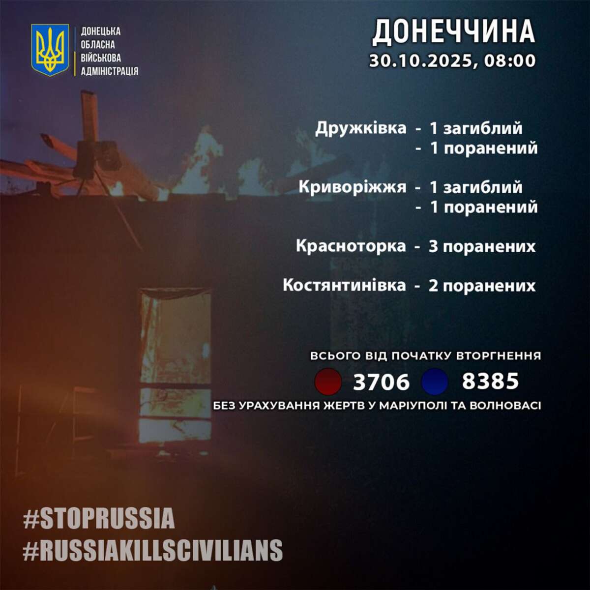 АктуальноНовости За 29 жовтня росіяни вбили 2 жителів Донеччини 30 октября 2025 - 07:46 Поделиться Facebook Twitter Telegram WhatsApp Viber VK За 29 жовтня росіяни вбили 2 жителів Донеччини: у Дружківці та Криворіжжі. Ще 7 людей в області за добу дістали поранення. - Реклама -