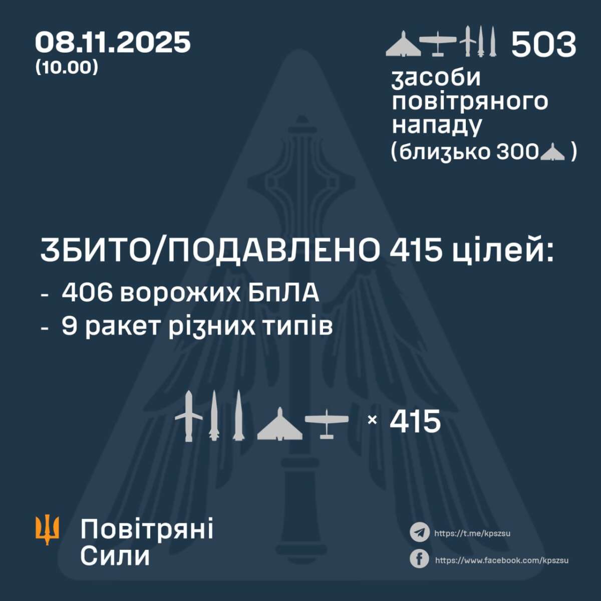 Силами ППО збито/подавлено 415 цілей противника.
