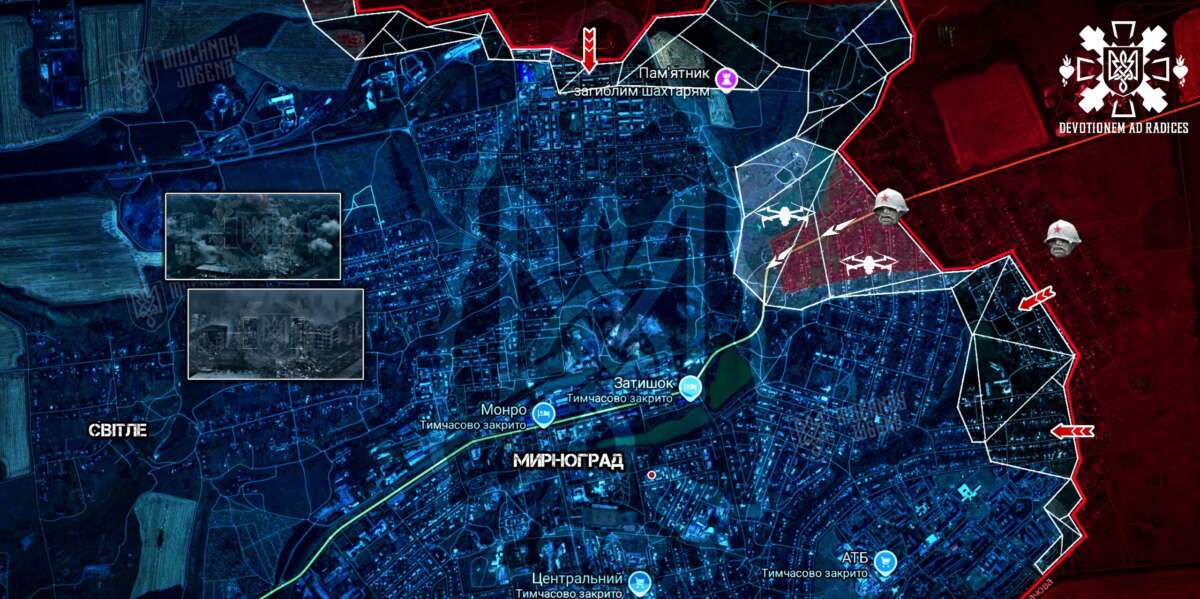 Противник давить зі сходу від Мирнограда і йде вздовж траси, просування поки що точкове, без надійного закріплення. Зараз утворюється сіра зона, підарчуки шаряться краями, пробують втиснутися в дорожню смугу але повністю не заходять, бо наші бійці там ще працюють і не дають їм укріпитися, по суті тут відбувається методичне підбирання.