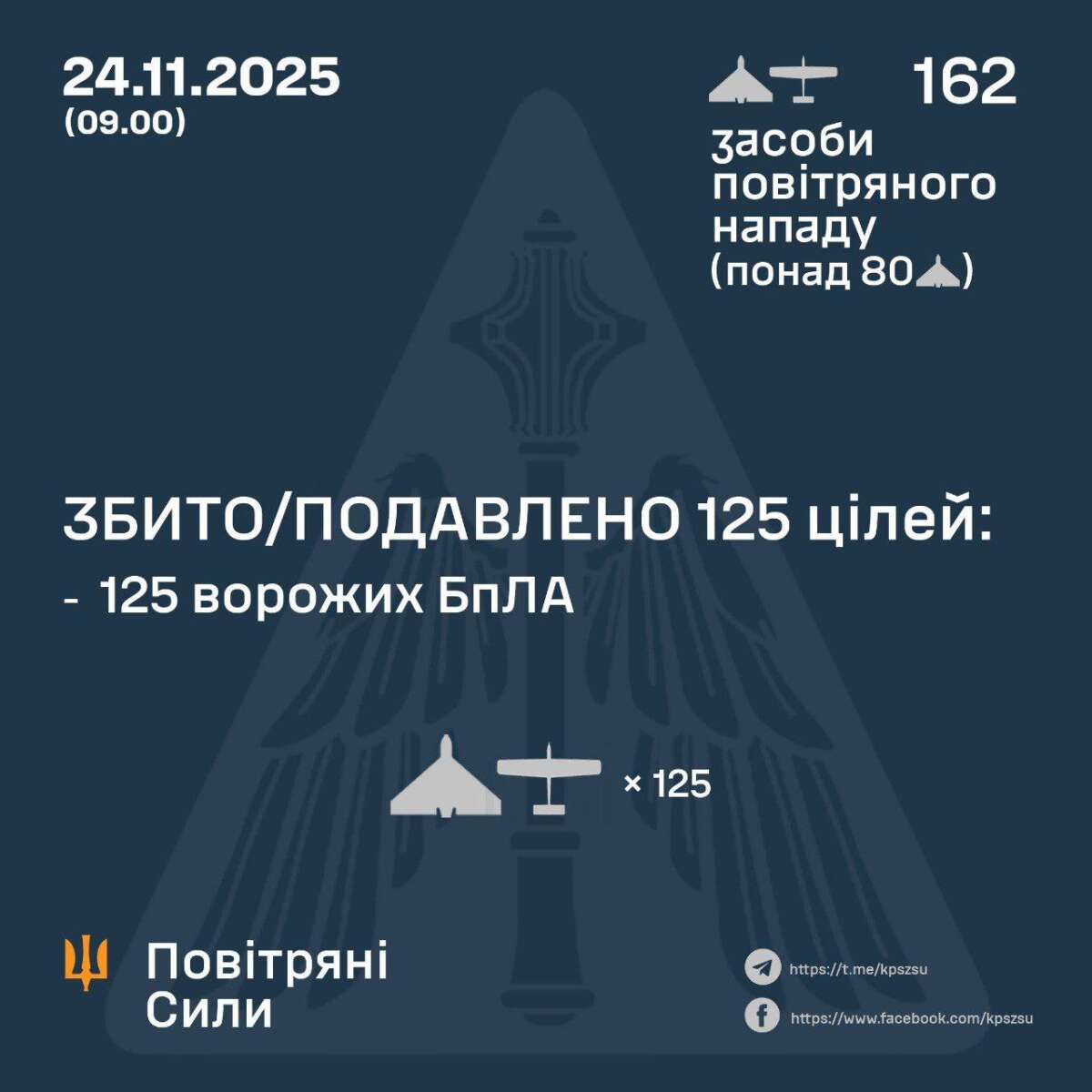 У ніч на 24 листопада ворог здійснив масовану атаку, застосувавши 162 ударні БпЛА типу Shahed, Гербера та інших моделей.
