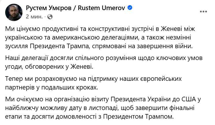 За його словами, українська та американська делегації досягли спільного розуміння щодо ключових умов мирної угоди, обговорених у Женеві.