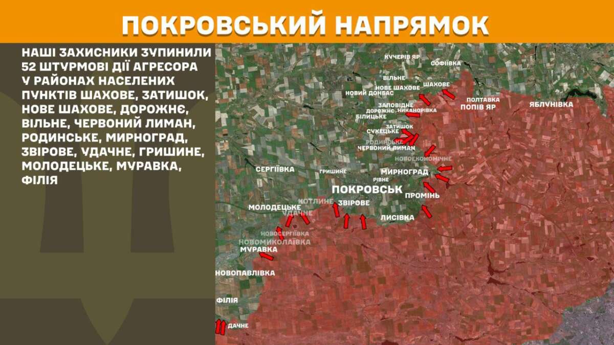 На Покровському напрямку наші захисники зупинили 52 штурмові дії агресора у районах населених пунктів Шахове, Затишок, Нове Шахове, Дорожнє, Вільне, Червоний Лиман, Родинське, Мирноград, Звірове, Удачне, Гришине, Молодецьке, Муравка, Філія.