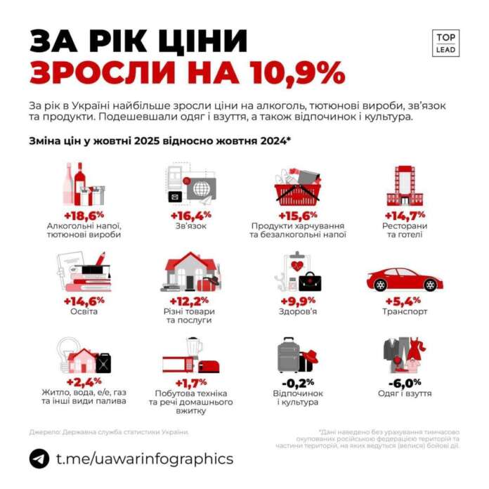 АктуальноНовости Ціни на алкоголь і тютюнові вироби зросли на 19% за рік 26 ноября 2025 - 13:30 Поделиться Facebook Twitter Telegram WhatsApp Viber VK Ціни на алкоголь і тютюнові вироби зросли на 19% за рік Також найбільше подорожчали: ▪️ зв’язок (16,4%) ▪️ продукти (15,6%) ▪️ ресторани та готелі (14,7%). - Реклама -