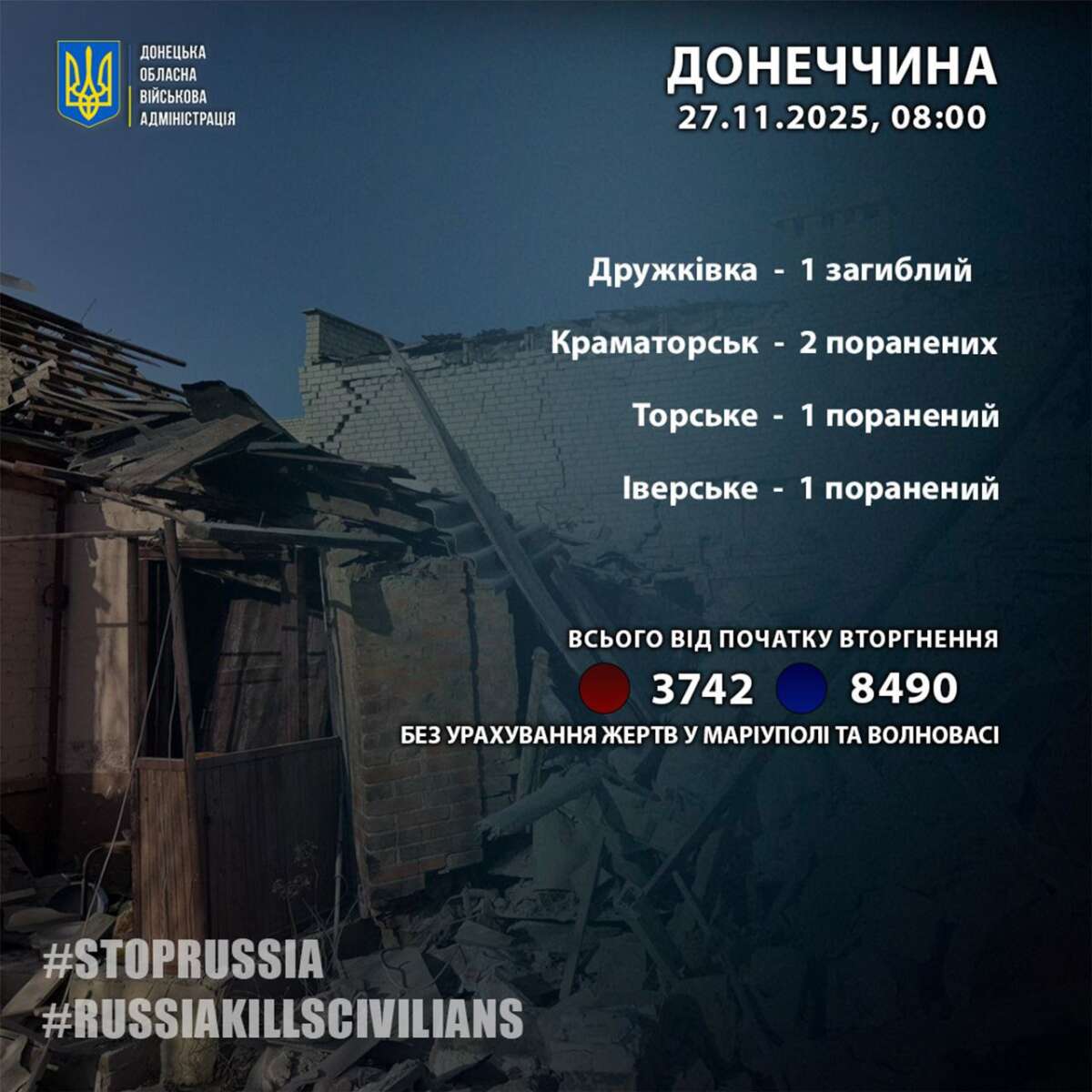 АктуальноНовости За 26 листопада росіяни вбили 1 жителя Донеччини – у Дружківці 27 ноября 2025 - 08:00 Поделиться Facebook Twitter Telegram WhatsApp Viber VK За 26 листопада росіяни вбили 1 жителя Донеччини – у Дружківці Ще 4 людини в області за добу дістали поранення: 2 в Краматорську, по 1 – в Торському та Іверському. - Реклама -