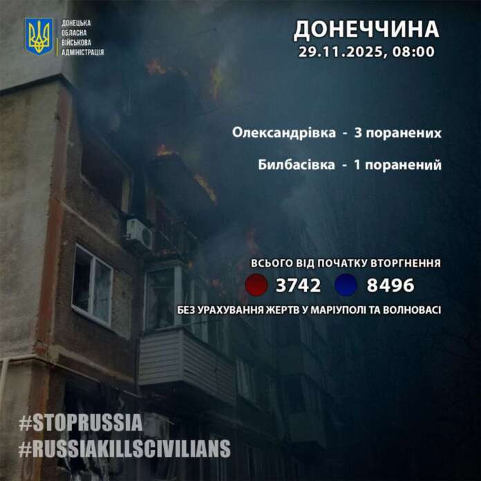 28 листопада росіяни поранили чотирьох жителів Донеччини: трьох в Олександрівці та одного в Билбасівці