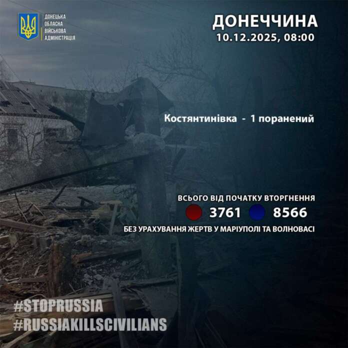 АктуальноНовости 9 грудня росіяни поранили одного жителя Донеччини 10 декабря 2025 - 08:24 Поделиться Facebook Twitter Telegram WhatsApp Viber 9 грудня росіяни поранили одного жителя Донеччини – у Костянтинівці - Реклама -
