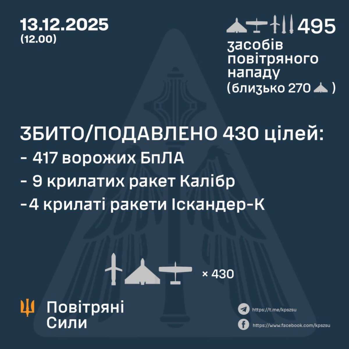 У ніч на 13 грудня ворог здійснив черговий комбінований удар по об’єктах критичної інфраструктури України, застосувавши ударні БпЛА та ракети повітряного, морського й наземного базування.