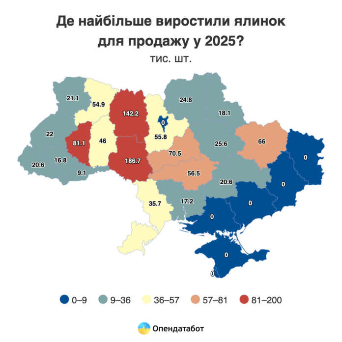 Найбільші обсяги святкових дерев для реалізації цього сезону зосереджені у двох регіонах: Вінниччина — 187 тисяч ялинок, або 19% від загальної кількості та Житомирщина — 142 тисячі, або 14%.