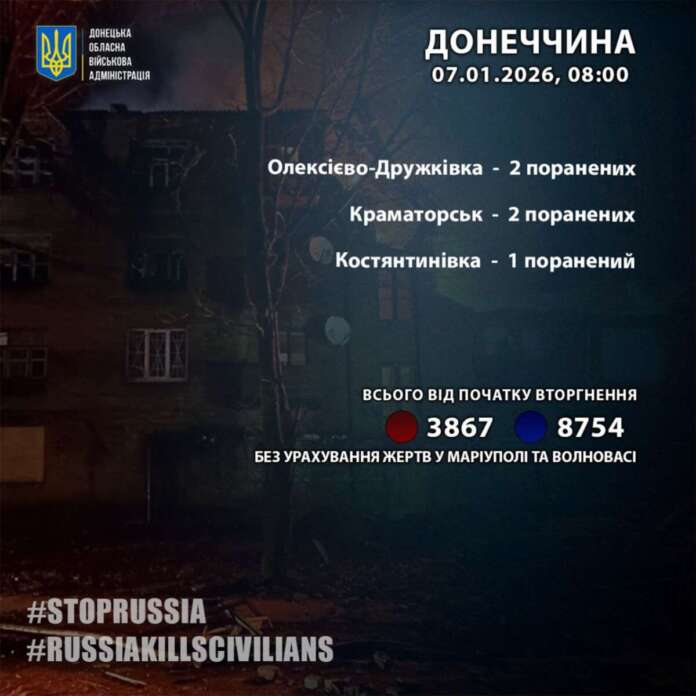 АктуальноНовости За 6 січня росіяни поранили 5 жителів Донеччини 7 января 2026 - 08:22 Поделиться Facebook Twitter Telegram WhatsApp Viber За 6 січня росіяни поранили 5 жителів Донеччини – по 2 в Олексієво-Дружківці та Краматорську, 1 у Костянтинівці. - Реклама -