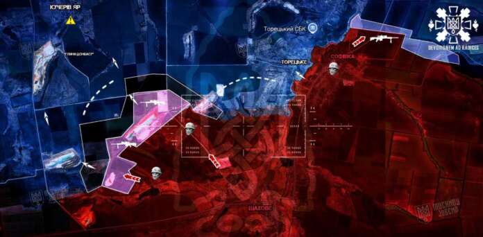 Окремо фіксується просування північніше кар’єру №3 — противник уже вийшов до району відвалу. Наступний логічний крок — спроба зайти до кар’єру «Глини Донбасу». У разі успіху знову загостриться ситуація навколо Кучерового Яру, де бої можуть відновитися з новою силою.