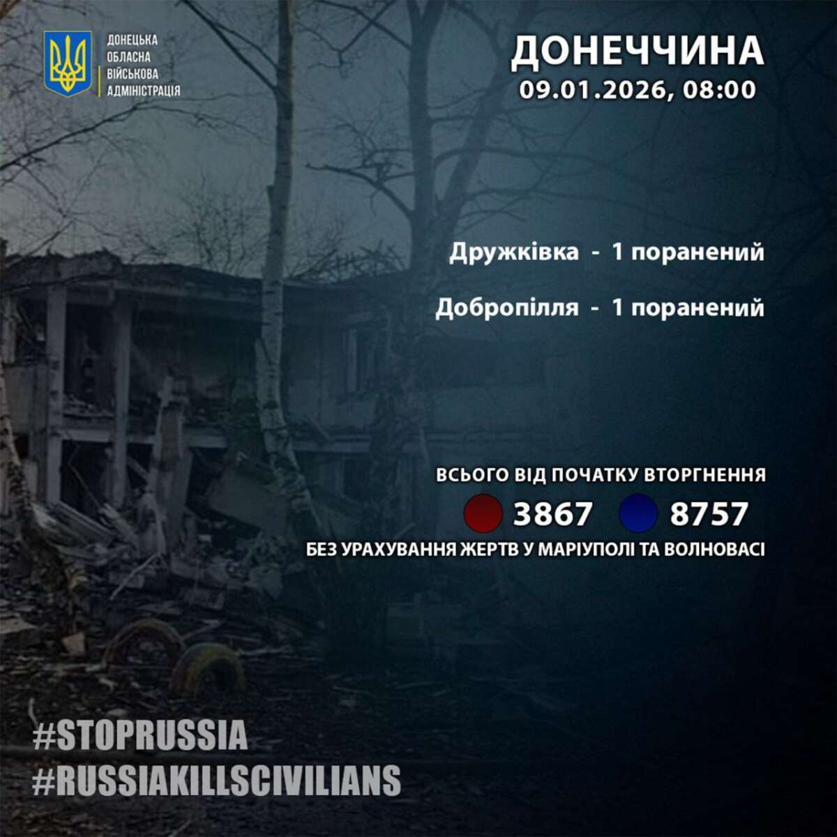 АктуальноНовости За 8 січня росіяни поранили 2 жителів Донеччини. 9 января 2026 - 08:23 Поделиться Facebook Twitter Telegram WhatsApp Viber Двоє людей дістали поранення на Донеччині від російських обстрілів протягом доби. Через російські обстріли поранені по одній людині у Добропіллі та Дружківці. - Реклама -