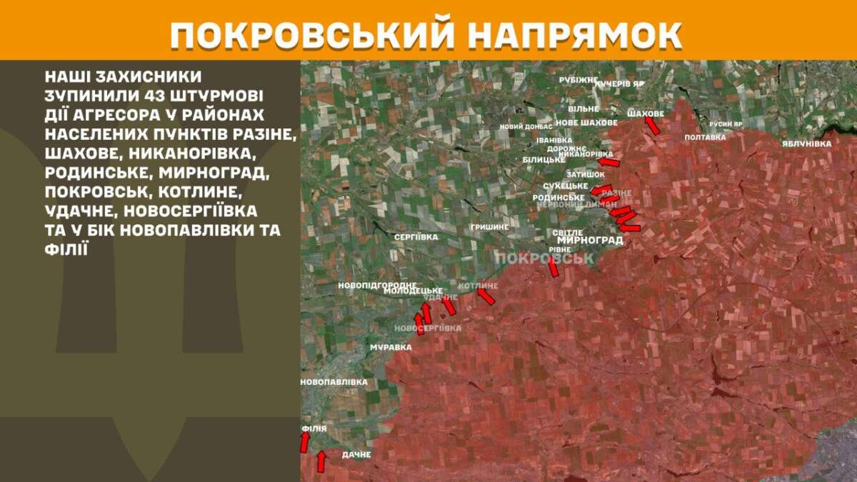 На Покровському напрямку наші захисники зупинили 43 штурмові дії агресора у районах населених пунктів Разіне, Шахове, Никанорівка, Родинське, Мирноград, Покровськ, Котлине, Удачне, Новосергіївка та у бік Новопавлівки та Філії.