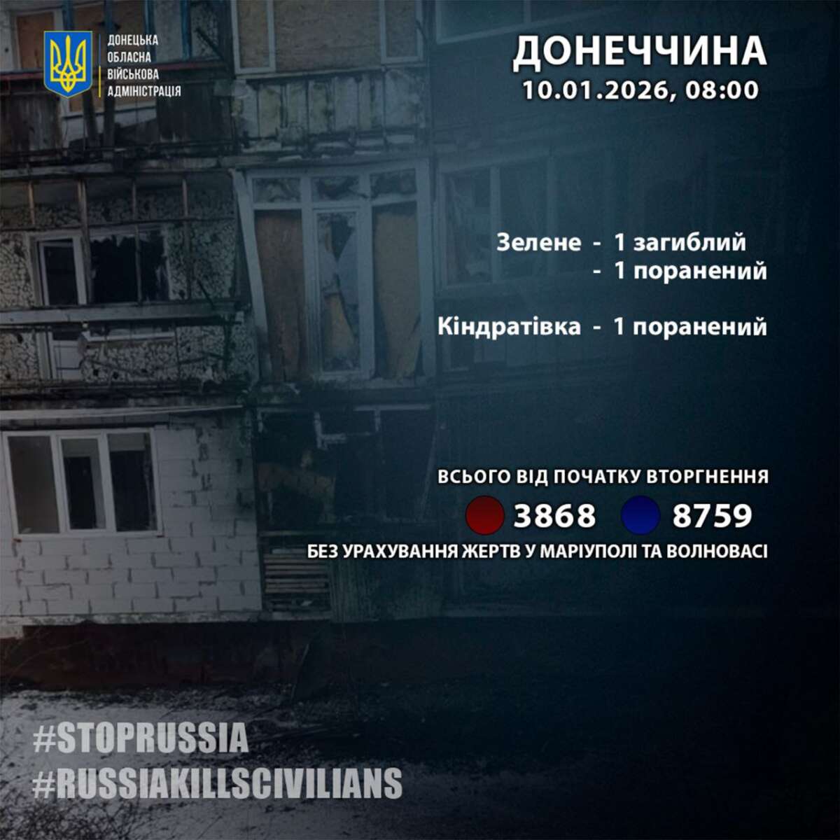 АктуальноНовости 9 січня росіяни вбили 1 жителя Донеччини 10 января 2026 - 08:38 Поделиться Facebook Twitter Telegram WhatsApp Viber 9 січня росіяни вбили 1 жителя Донеччини — у Зеленому. Ще 2 людини в області за добу дістали поранення. - Реклама -
