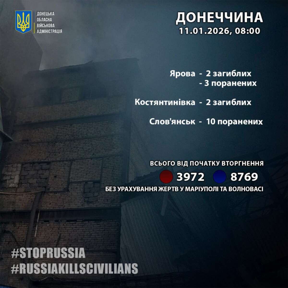 АктуальноНовости За 10 січня росіяни вбили 4 жителів Донеччини 11 января 2026 - 08:54 Поделиться Facebook Twitter Telegram WhatsApp Viber За 10 січня росіяни вбили 4 жителів Донеччини: 2 у Яровій і 2 у Костянтинівці. Ще 10 людей в області за добу дістали поранення. - Реклама -