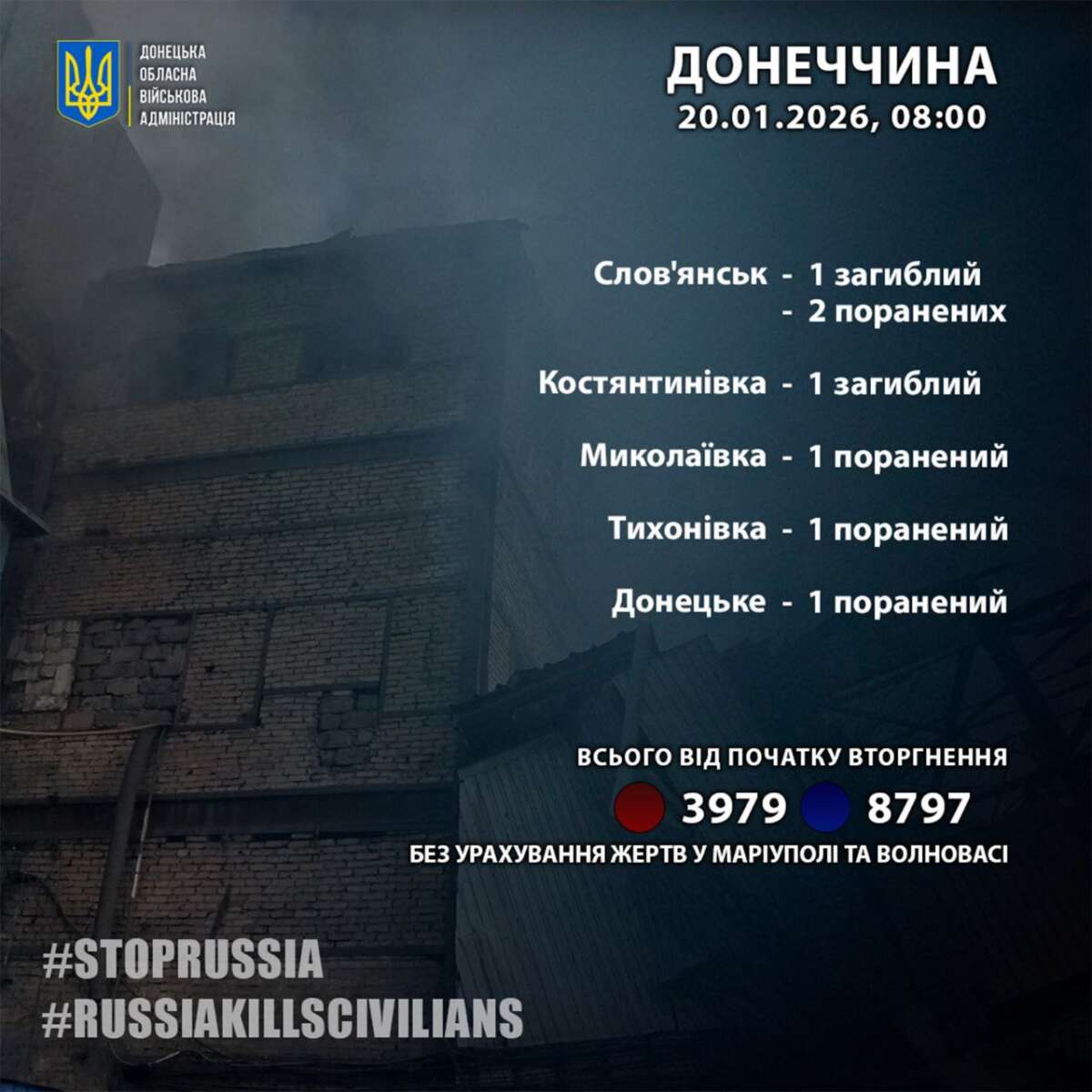 АктуальноНовости За 19 січня росіяни вбили 2 жителів Донеччини 20 января 2026 - 08:01 Поделиться Facebook Twitter Telegram WhatsApp Viber За 19 січня росіяни вбили 2 жителів Донеччини: у Слов’янську та Костянтинівці. Ще 5 людей в області за добу дістали поранення. - Реклама -