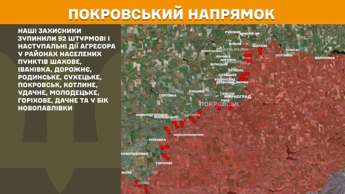На Покровському напрямку наші захисники зупинили 92 штурмові і наступальні дії агресора у районах населених пунктів Шахове, Іванівка, Дорожнє, Родинське, Сухецьке, Покровськ, Котлине, Удачне, Молодецьке, Горіхове, Дачне та у бік Новопавлівки.