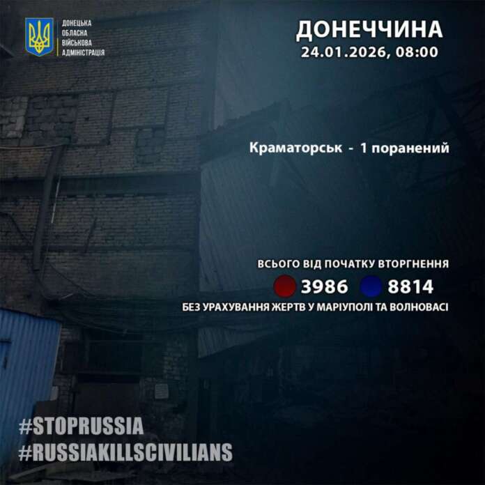 АктуальноНовости 23 січня росіяни поранили одного жителя Краматорська на Донеччині 24 января 2026 - 08:01 Поделиться Facebook Twitter Telegram WhatsApp Viber 23 січня росіяни поранили одного жителя Краматорська на Донеччині - Реклама -