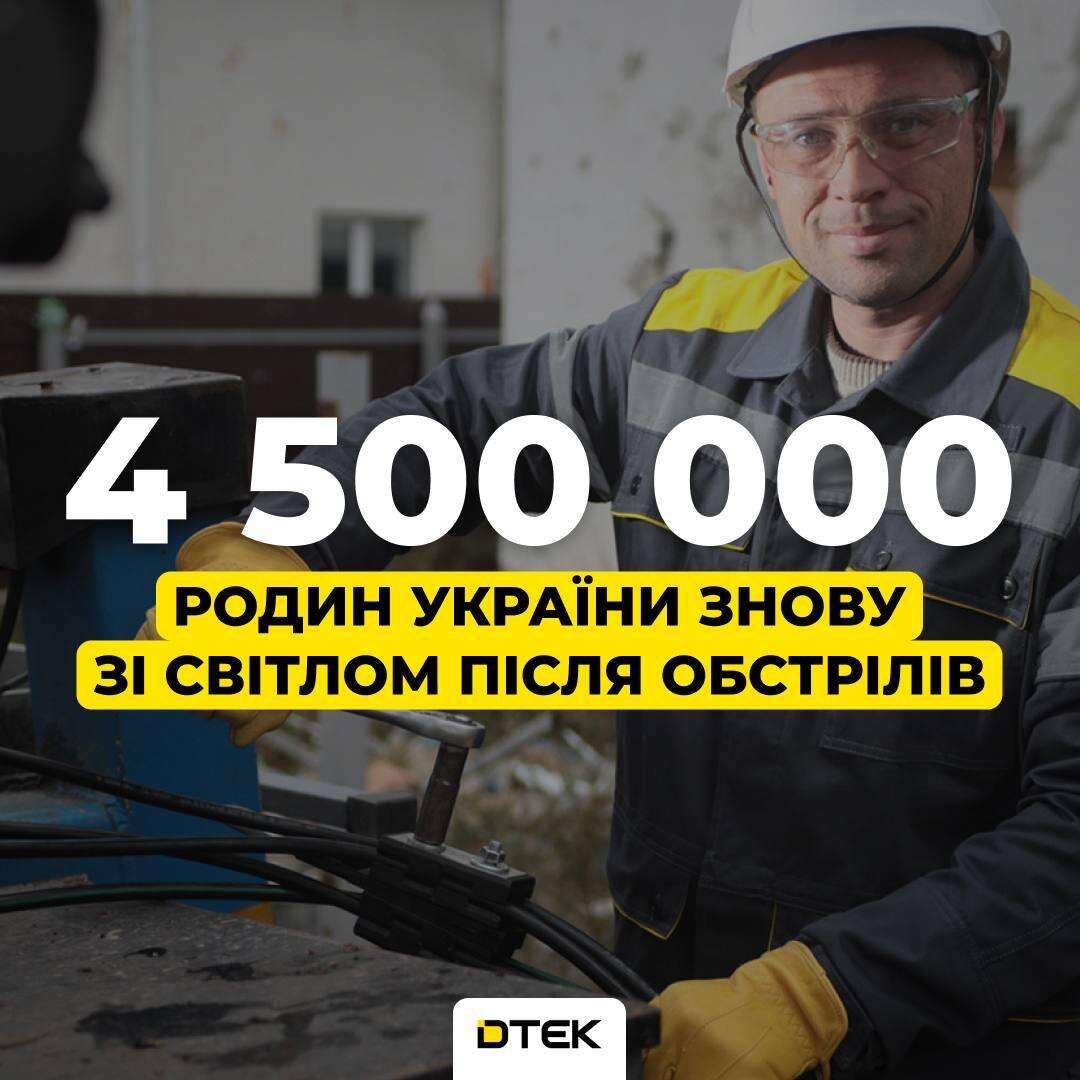 ДТЕК повертає світло: підсумки січня — понад 4,5 млн родин знову з електрикою після обстрілів рф