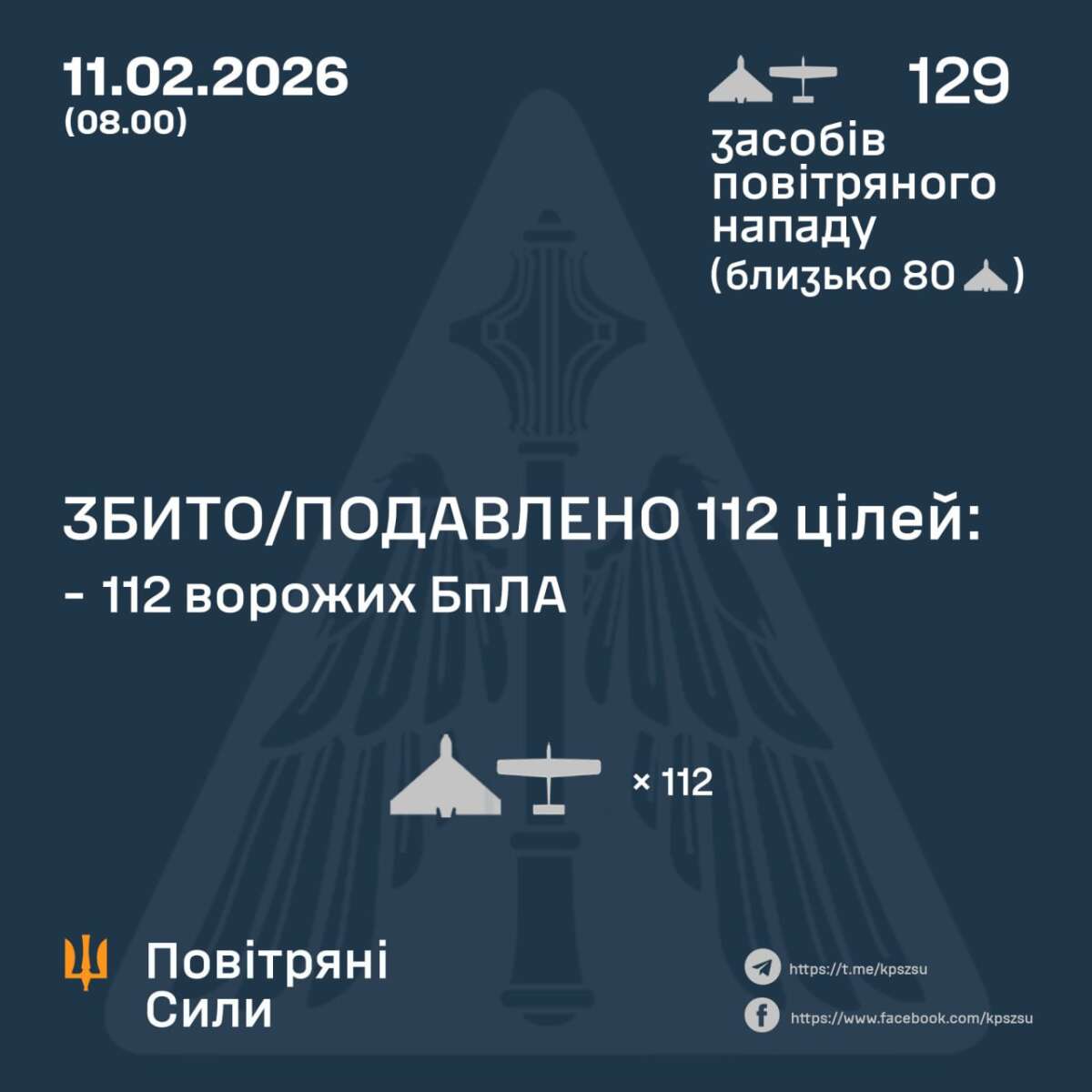 ППО знешкодила 112 безпілотників, повідомили у Повітряних силах. Влучання 15 БпЛА зафіксували на восьми локаціях.