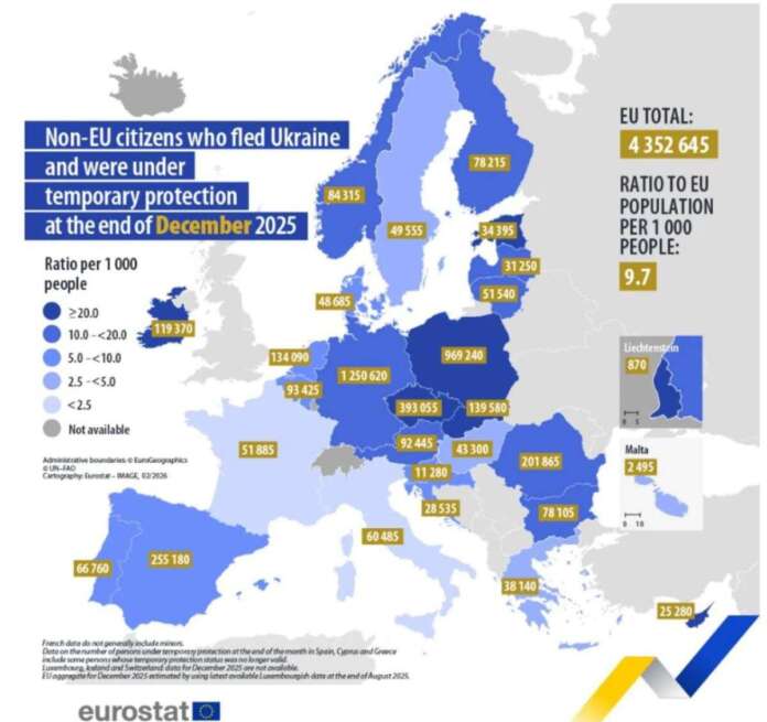 Станом на 31 грудня 2025 року у країнах Європейського Союзу статус тимчасового захисту мали 4,35 млн українських біженців. У порівнянні з кінцем листопада 2025 року їхня кількість збільшилася на 24 675 осіб, або на 0,6%