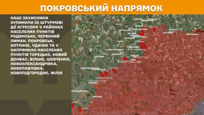 На Покровському напрямку наші захисники зупинили 42 штурмові дії агресора у районах населених пунктів Родинське, Червоний Лиман, Покровськ, Котлине, Удачне та у напрямках населених пунктів Торецьке, Новий Донбас, Вільне, Шевченко, Новоолександрівка, Новопавлівка, Новопідгороднє, Філія.